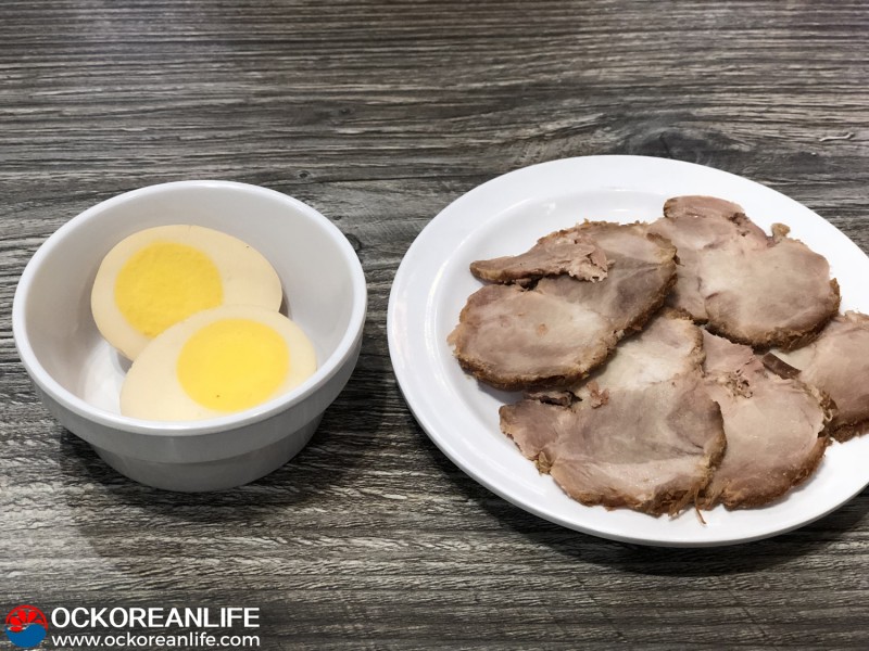 먼저 주문한 간장에 조린 계란과 차슈(돼지고기)가 나왔습니다.