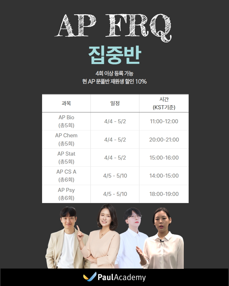 [2026 AP 시험 대비] “3월 MCQ가 준비 되었다면 마지막으로 FRQ에서 점수가 갈립니다.” 4월 FRQ 집중반 개강!