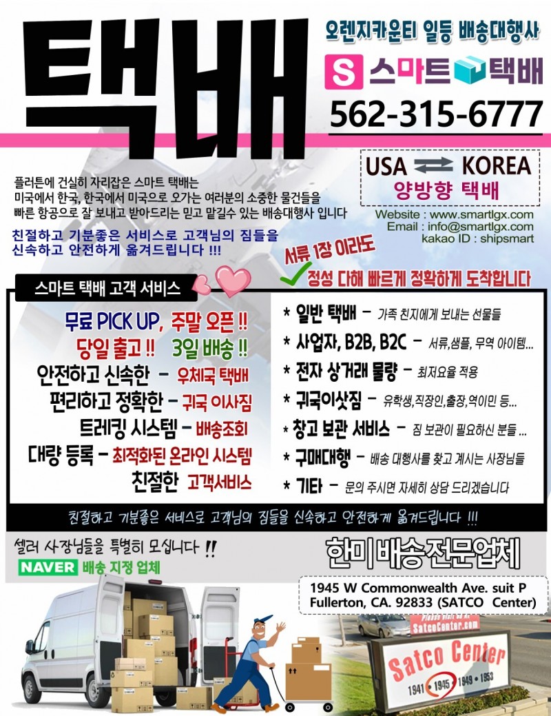 한국으로 보내시거나 한국에서 미국으로 보내실 물건이 있으시면 저희 스마트 택배에서 최저가에 보내드리겠습니다