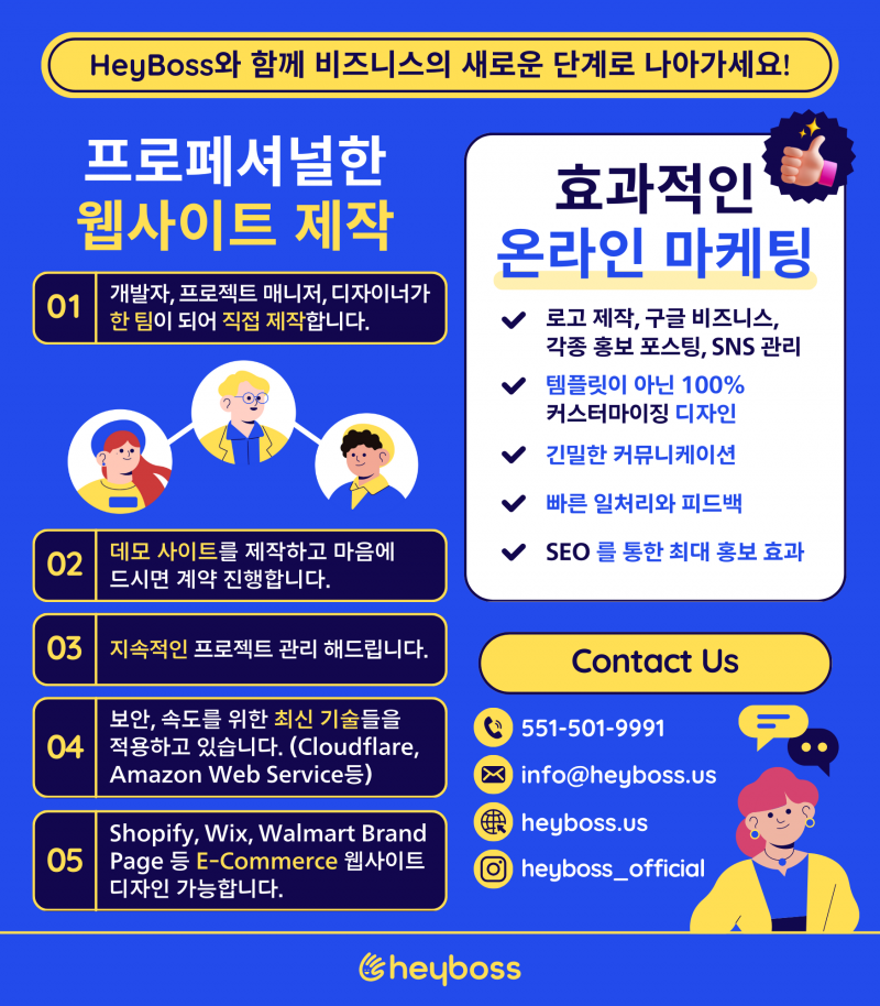 대부분의 회사&사장님께서 웹사이트 제작과 온라인 마케팅을 하는데 시간을 할애하기 어려워하고, 지속적인 관리가 안되 어려움을 겪고 있습니다. 각 팀 단위로 회사 하나하나를 케어하기 때문에 다른 업체와는 다르게 빠른 응답속도와 원활한 communication을 통해 보다 효과를 최대화하고 있습니다. HeyBoss는 여러분의 성공을 위해 최선을 다하고 있습니다. 우리와 함께 비즈니스의 새로운 단계로 나아가세요!