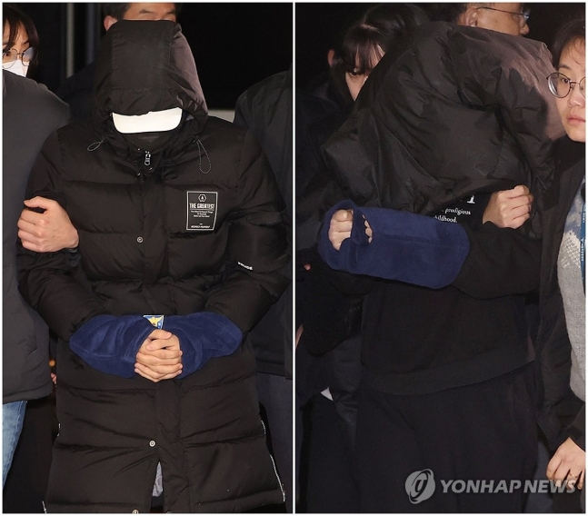 오후 9시 37분께 종로경찰서 현관 앞에 정차한 호송차량에서 경찰관과 함께 내린 이들은 검은 패딩점퍼로 얼굴을 가리며 고개를 숙이고 있었다.