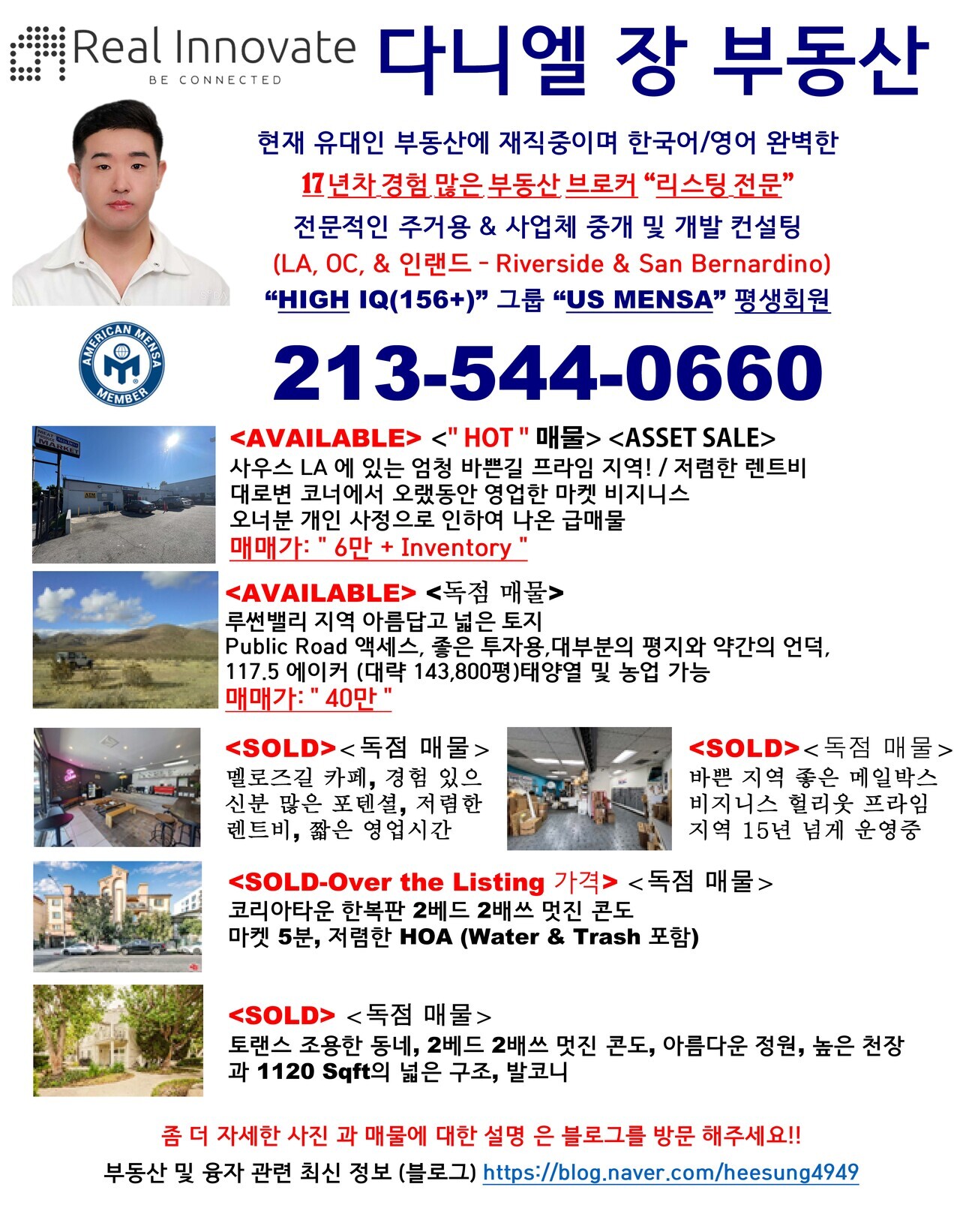 주거용 (Residential), 상업용 (Commercial), & 사업체 및 투자용 부동산들을 전문적으로 중개하고 있습니다.