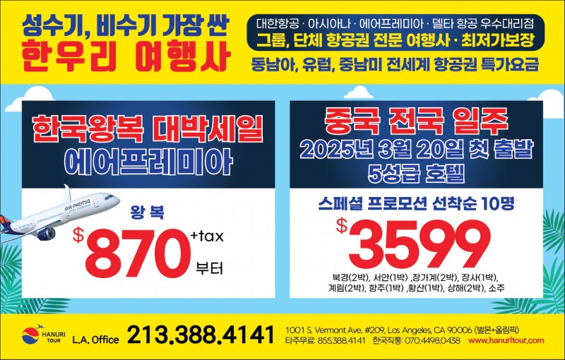 ★ 미국 전지역,북미, 중남미, 유럽, 동남/북아시아, 선교방문,고국 방문,신혼 여행,가족 여행,크르즈 관광,단체 관광, 등등 모든 항공권및 관광 패키지 상품 취급 합니다.