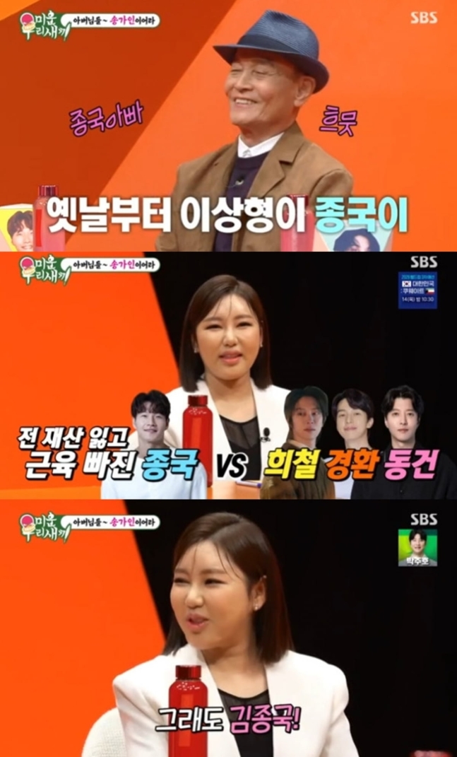 이날 MC 신동엽은 "가인 씨 이상형이 김종국이라고 한다"며 김종국 아버지에게 "가인 씨 같은 며느리가 집에 들어온다면 어떨 것 같냐"라고 물었다. 이에 김종국 부친은 "상당히 곱게 보고 있다"고 만족해했다.